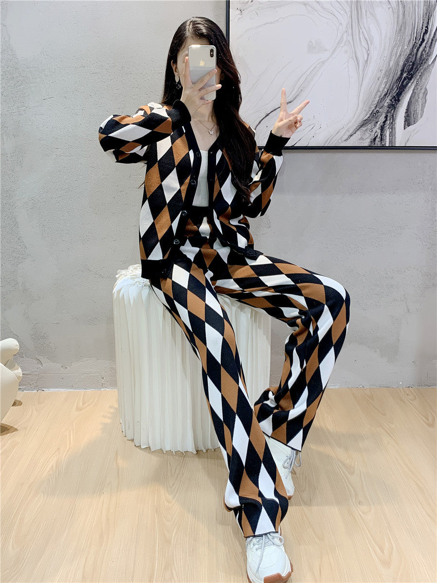 Női őszi kockás alkalmi kötött kardigán és nadrág kétrészes szett