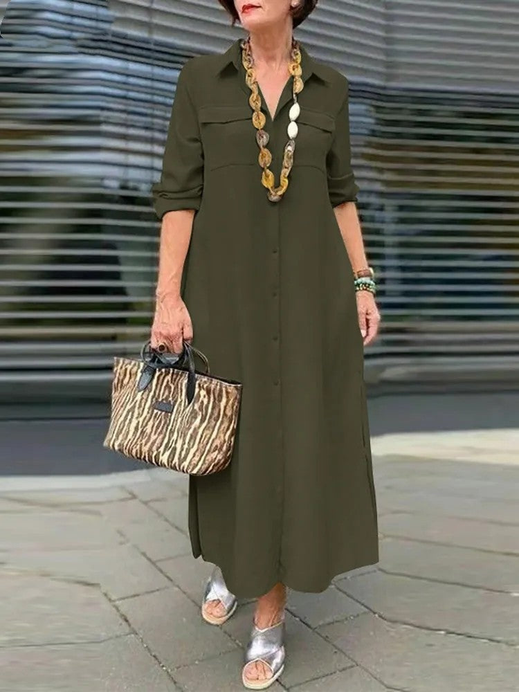 Elegáns, egyszínű női, hosszú ujjú, gombos, hajtókás ruha 2023-ból