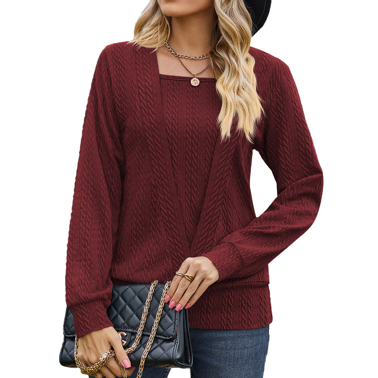 2023. őszi tél, új, szögletes nyakú keresztezett, egyszínű, hosszú ujjú bő póló