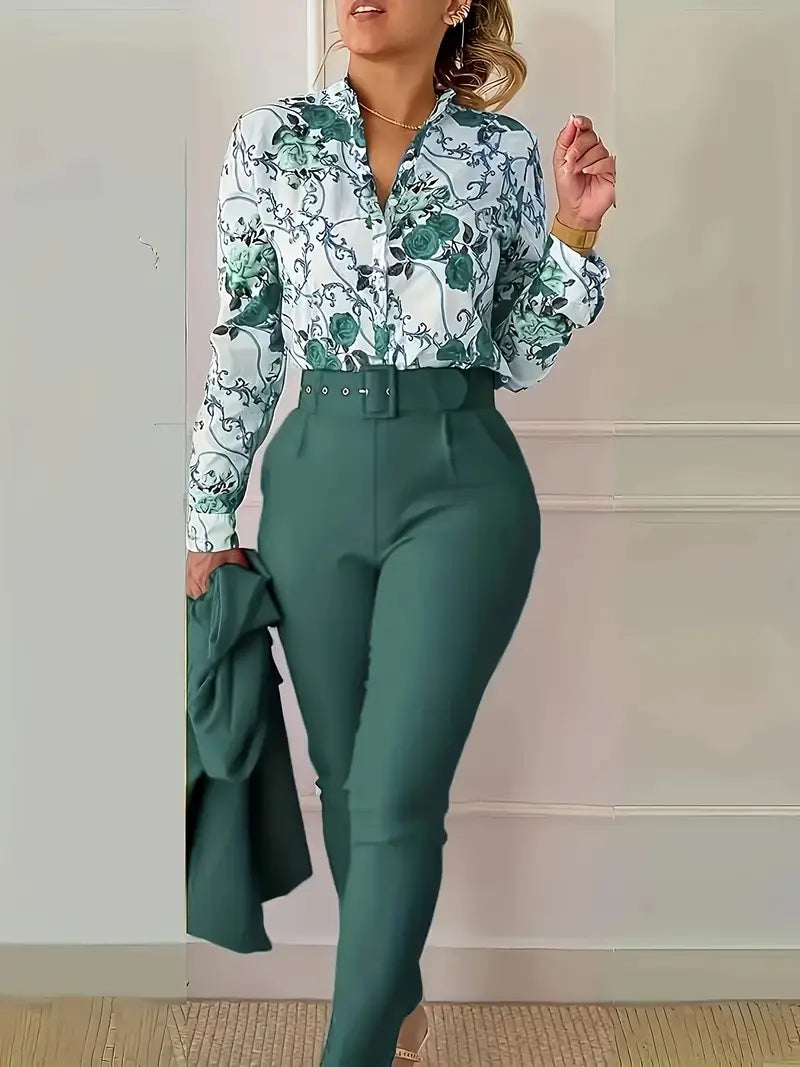 Elegáns kétrészes szett – Virágos blúz, öves nadrág, V-nyakkivágás.