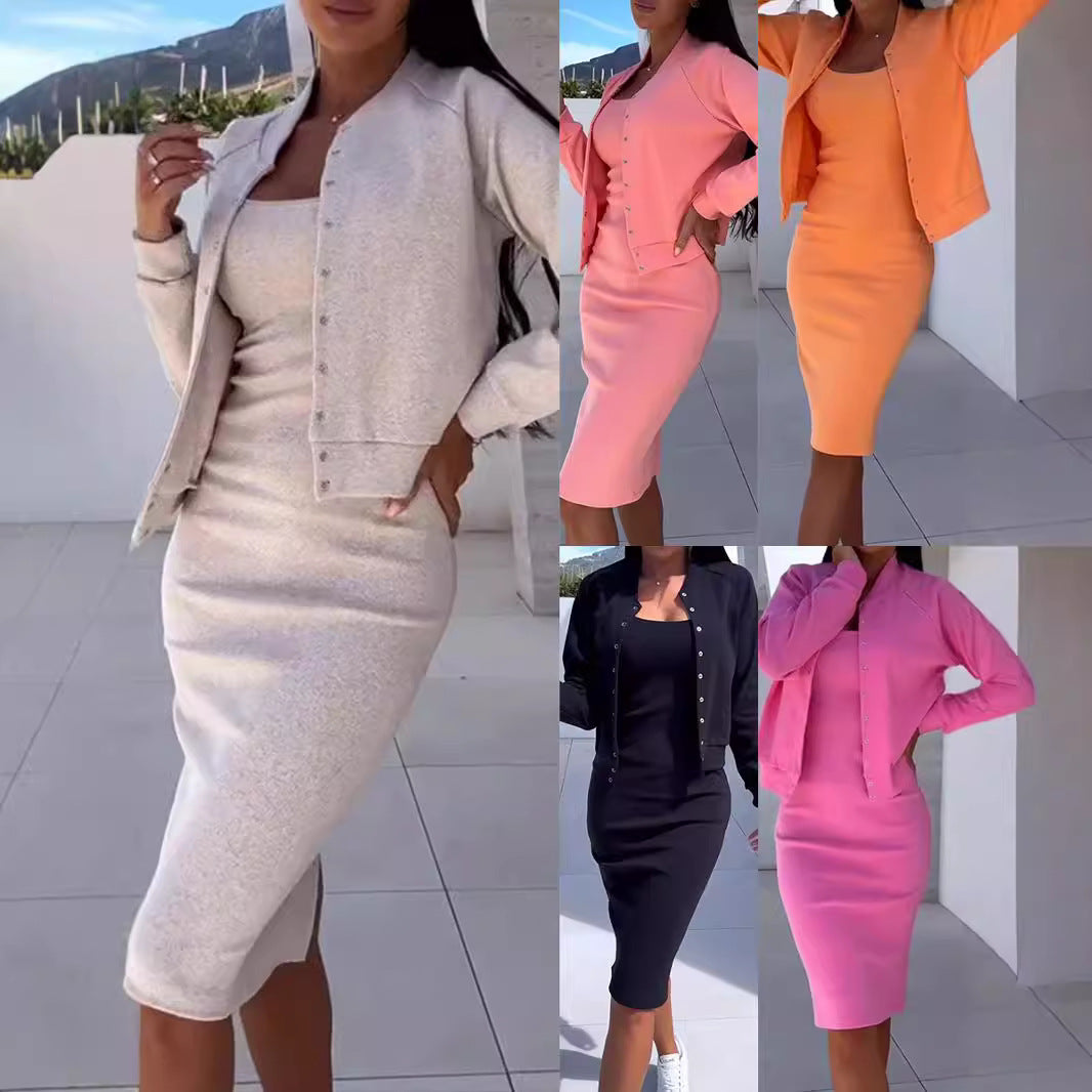 Egy dögös kétrészes szett harisnyaszoknyával és kabáttal