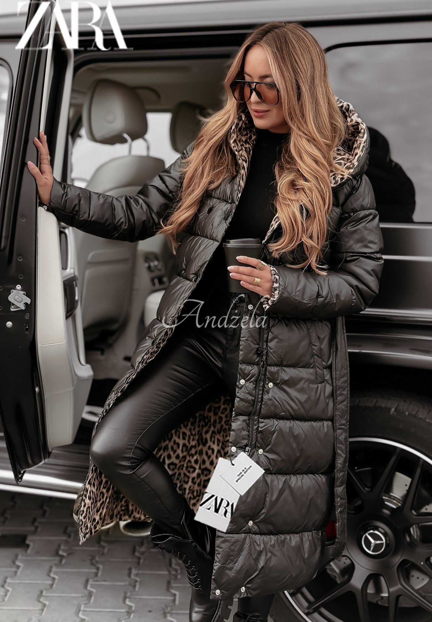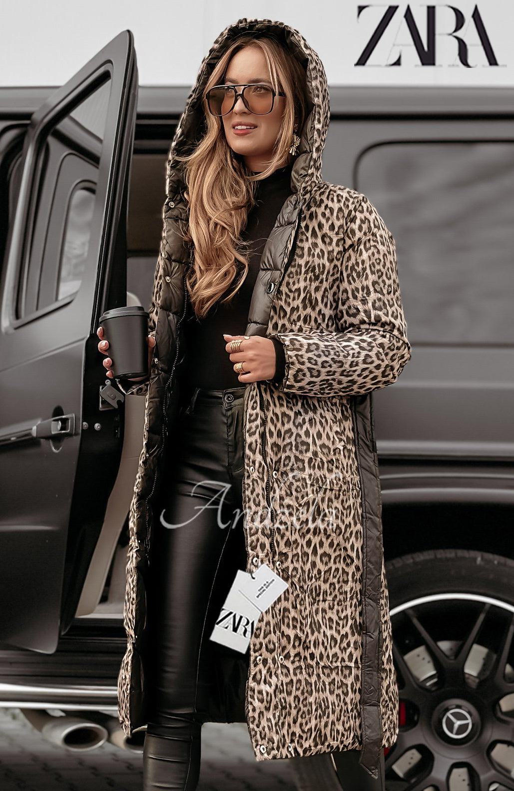 Divatos és meleg, kétoldalas hosszú kabát leopárdmintával