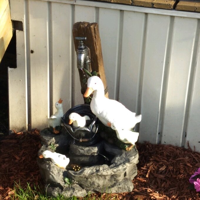 Élvezze a szabadtéri pihenést a tornác szökőkútjában fürdő kacsacsaláddal. Ez a szökőkút tartós poligyantából készült, és ideális kültéri használatra. "A tornácos szökőkút egy anyakacsát ábrázol négy kiskacsával a vízszivattyúnál. A csobogó víz hangja és látványa minden bizonnyal segít egy békés kert kialakításában."
