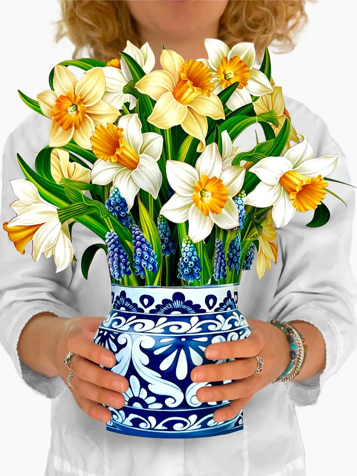 Angol nárciszok: A Nárcisz Pop Up Bouquet egy gyönyörű kártya, amely a felemelő érzelmeket és támogatást ünnepli. A nárcisz egy strapabíró tavaszi virág, amely hagyományosan a kitartást és a sikert szimbolizálja. Ennek az elrendezésnek a fényes virágzása túléli a szokásos vágott virágokat, és továbbra is virágzik anélkül, hogy vízre vagy tartósítószerekre lenne szüksége. Könnyen karbantartható és hosszan tartó virágok, ezek a virágok még évekig megörvendeztetik az Ön különleges személyét.