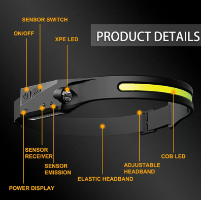 - elülső zseblámpa, horgászat, kempingezés, túrázás, mozgásérzékelővel, vízálló esőálló, COB és XPE led szalag