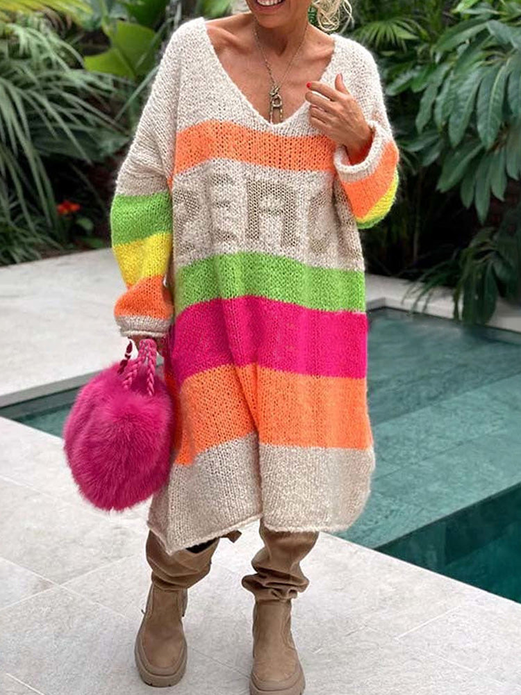 Színes, hosszú ujjú, V-nyakú, kasmírból készült pulóverruha