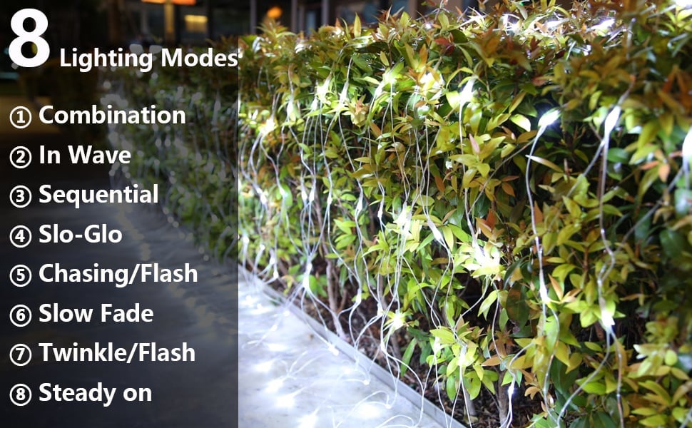 8 mód memória funkcióval: Ez a hálós karácsonyi lámpa 8 különböző üzemmóddal rendelkezik. Kombinált, Hullámos, Soros, Slo-glo, Chase, Slow Fade, Flash és Stay. A hálózati fényadapter egy beépített memóriachip, amely elmenti az utolsó módbeállítást, és nem kell minden nap visszaállítani az üzemmódot