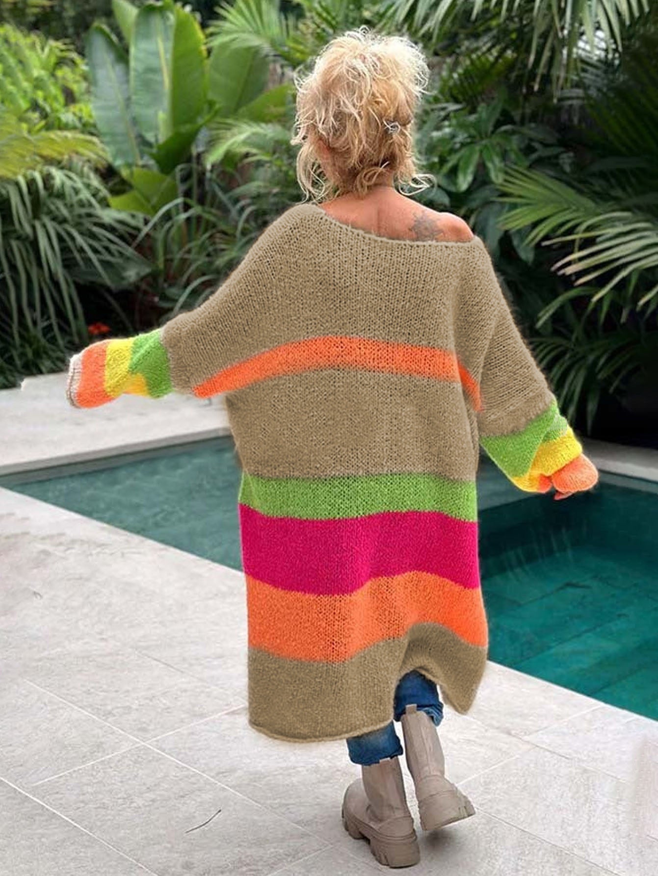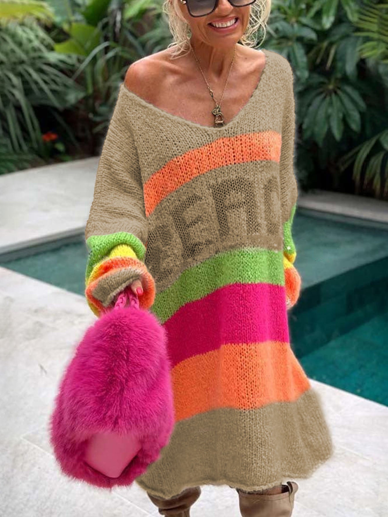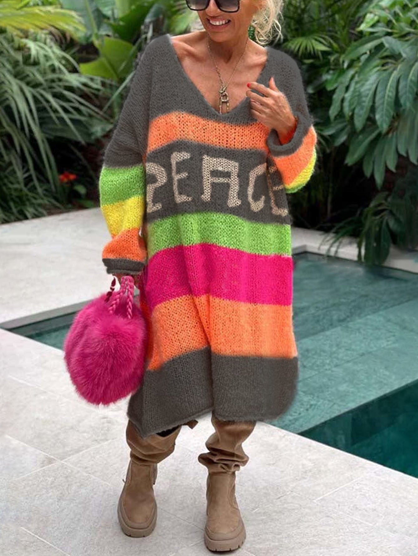 ez a szivárványcsíkos pulóver sokoldalú kiegészítője ruhatárának, és könnyen viselhető bármilyen alkalomra. Ez a pulóver élénk irizáló színekkel és klasszikus kötöttséggel rendelkezik a játékos, mégis stílusos megjelenés érdekében.
