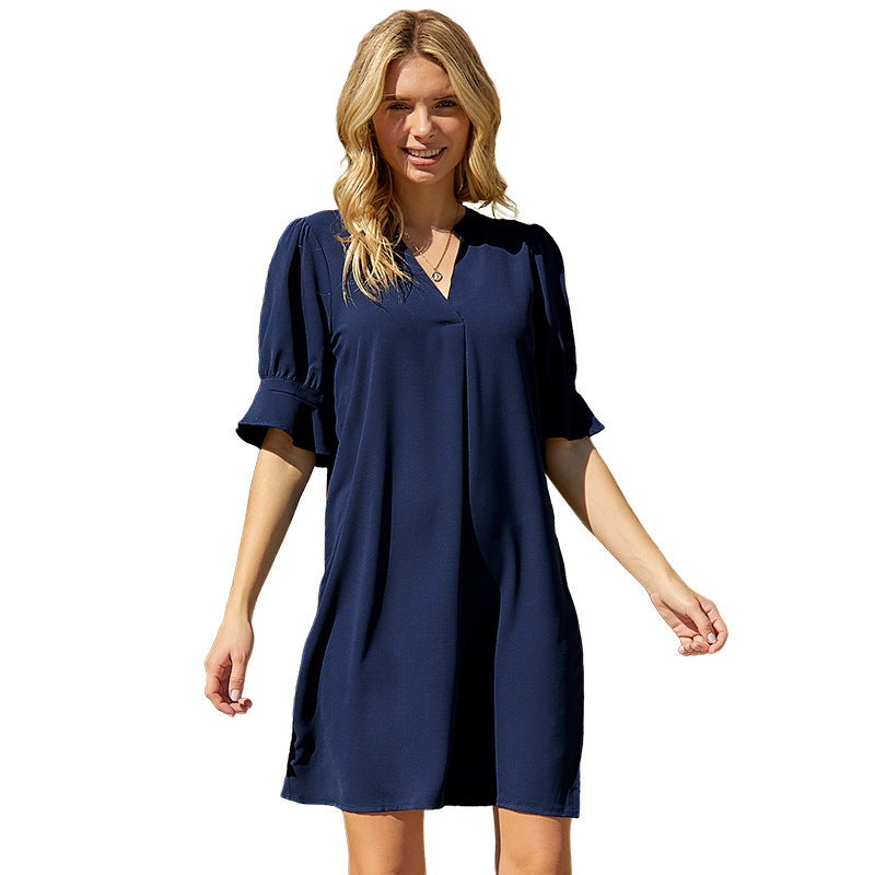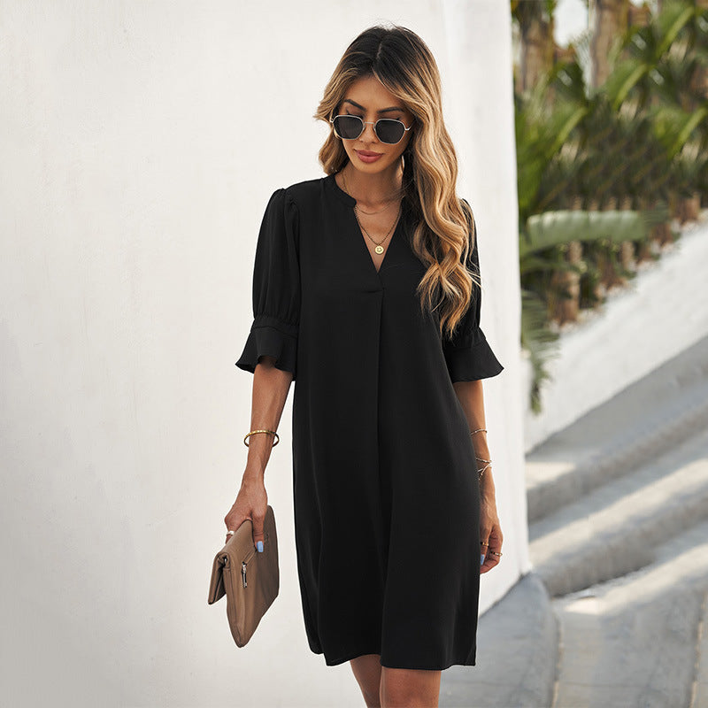 Nyári új sifon ruha női egyszínű laza alkalmi V-nyakú rövid ujjú térdig érő szoknya