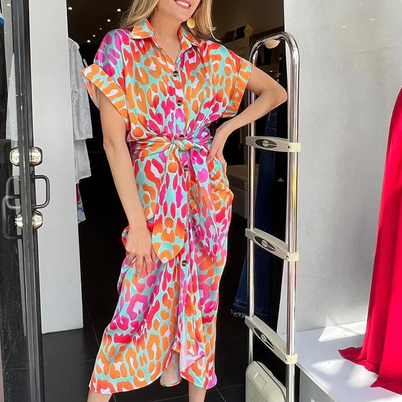Hosszú, színes mintás ruha derékban bő nyakkendővel