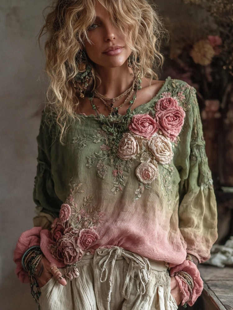 Pamut és lenvászon felső 3D rózsahímzéssel