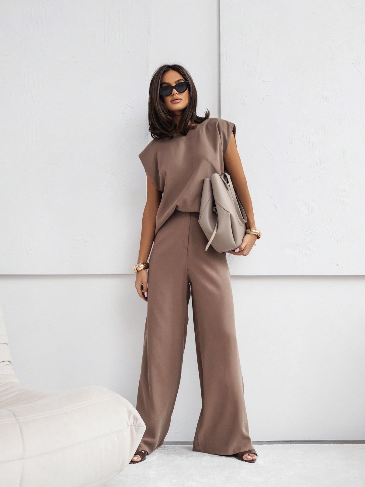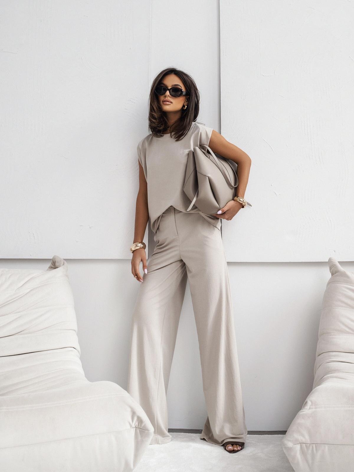 Komplett kétrészes szett - tartalmaz egy ujjatlan blúzt és egy bő szárú nadrágot. Ez egy stílusos, azonnal viselhető kombináció, amely leegyszerűsíti a ruhatárad kiválasztását bármilyen alkalomra.